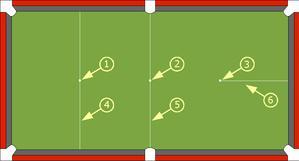 Разметка стола для пирамиды. Отметки: 1 — передняя, 2 — серединная, 3 — задняя. Линии: 4 — дома, 5 — серединная, 6 — выставления шаров.